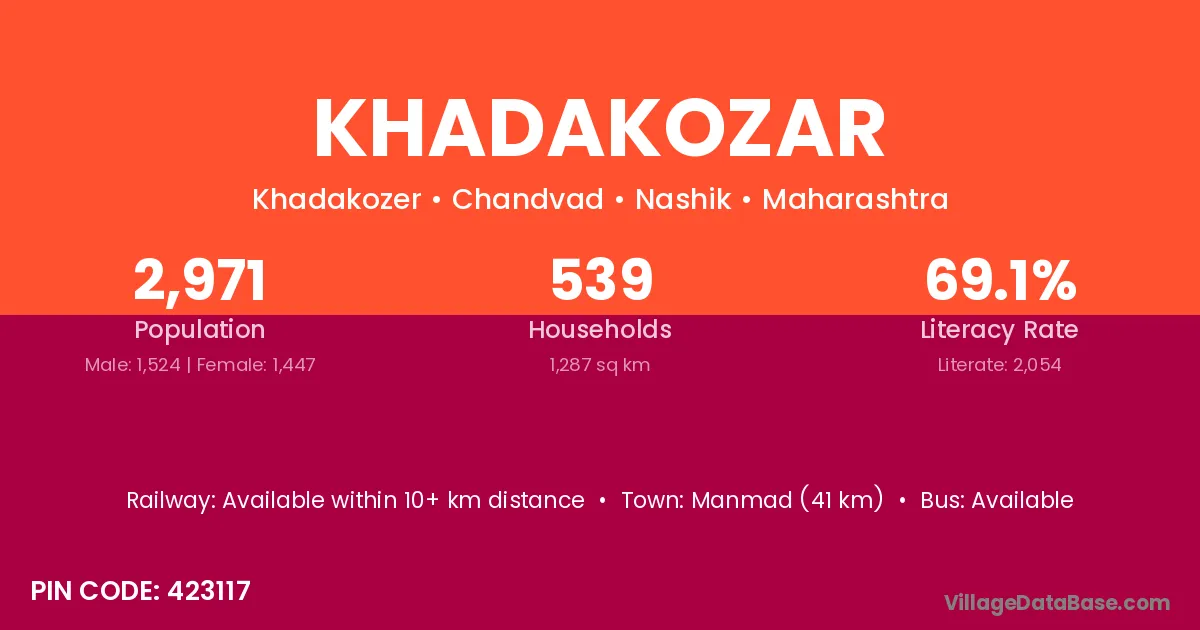 Manmad (41 km) is the nearest town to Khadakozar village for major economic activities and is located approximately 41 km away.