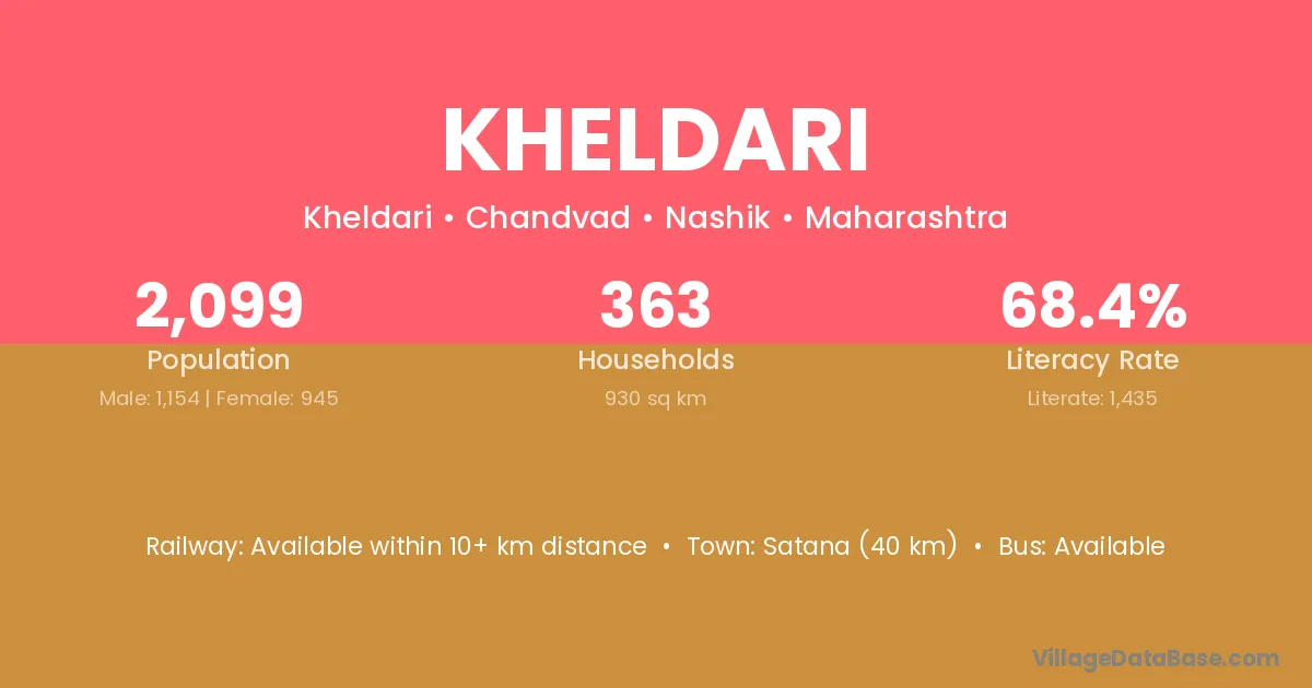 Satana (40 km) is the nearest town to Kheldari village for major economic activities and is located approximately 40 km away.