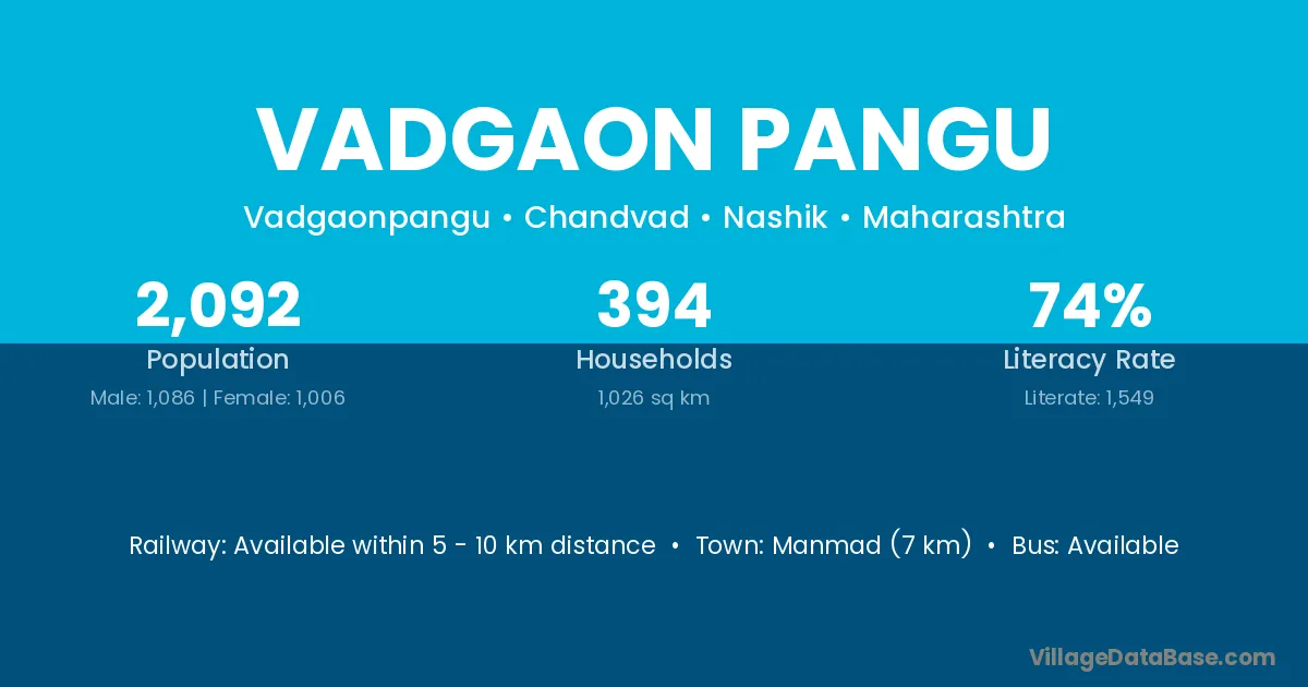 Manmad (7 km) is the nearest town to Vadgaon Pangu village for major economic activities and is located approximately 7 km away.