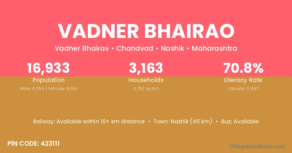 Vadner Bhairao village has a total population of 16,933 people, of which 8,769 are males and 8,164 are females.