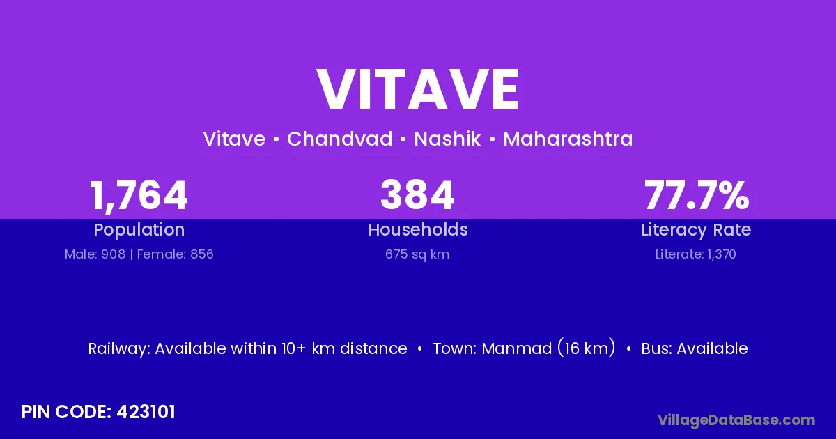 Manmad (16 km) is the nearest town to Vitave village for major economic activities and is located approximately 16 km away.