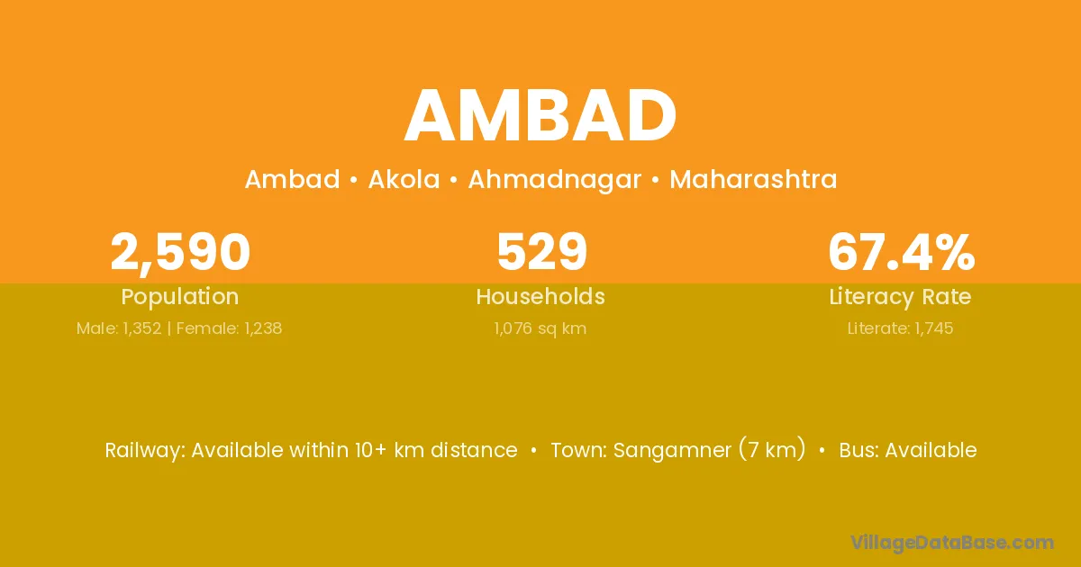 The literacy rate of Ambad village is 52.80%. Male literacy stands at 60.95% and female literacy at 44.95%.