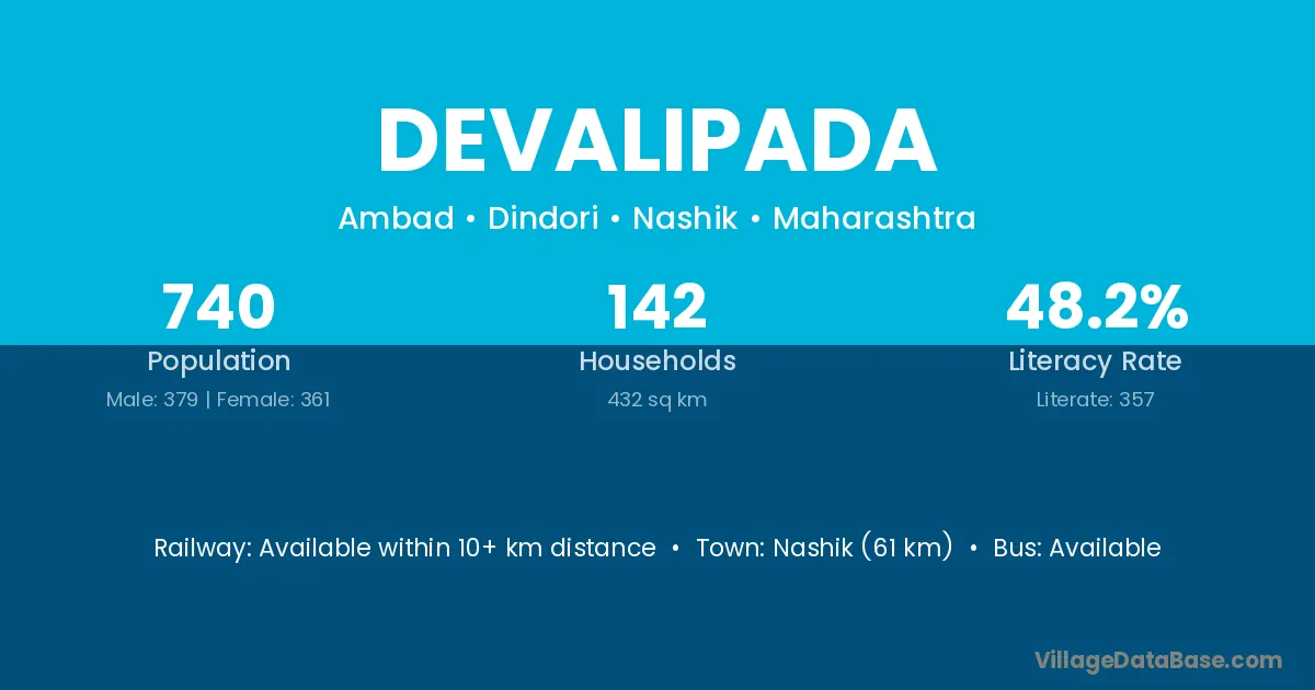 Devalipada village has a total population of 740 people, of which 379 are males and 361 are females.