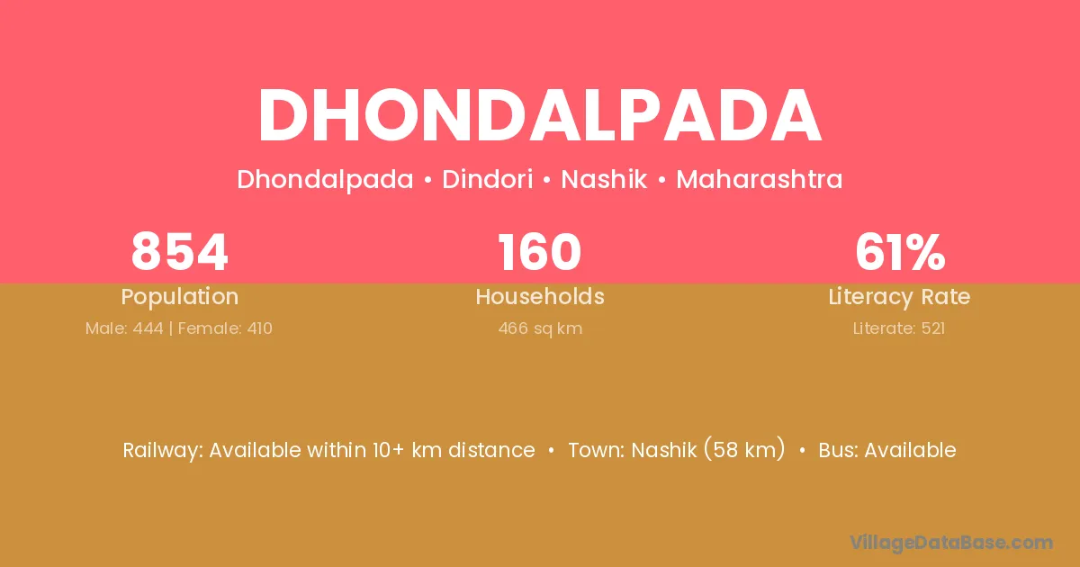 Nashik (58 km) is the nearest town to Dhondalpada village for major economic activities and is located approximately 58 km away.