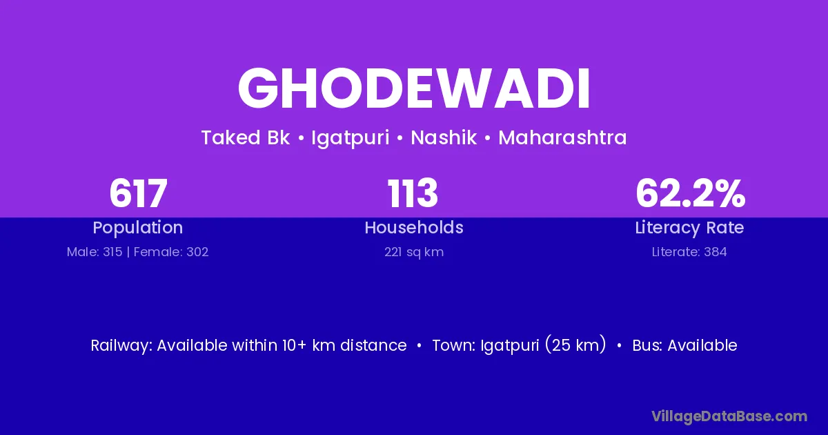 Nashik (38 km) is the nearest town to Ghodewadi village for major economic activities and is located approximately 38 km away.