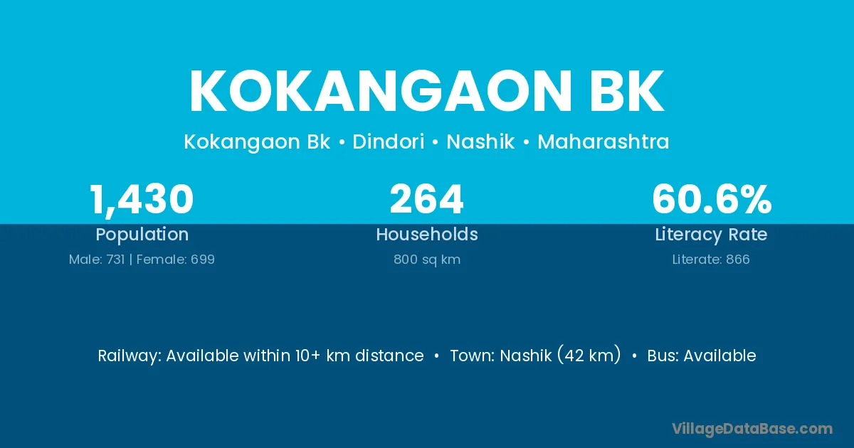 Nashik (42 km) is the nearest town to Kokangaon Bk village for major economic activities and is located approximately 42 km away.