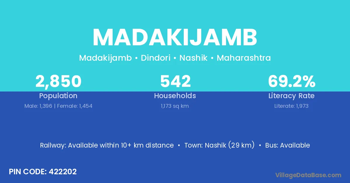 Nashik (29 km) is the nearest town to Madakijamb village for major economic activities and is located approximately 29 km away.