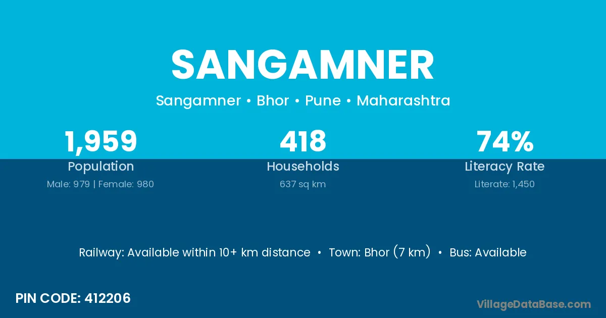 The literacy rate of Sangamner village is 63.67%. Male literacy stands at 69.65% and female literacy at 57.50%.