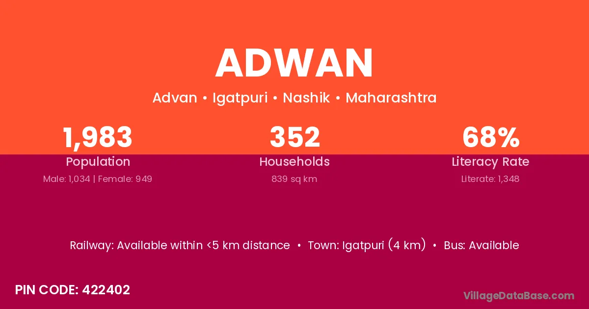 Igatpuri (4 km) is the nearest town to Adwan village for major economic activities and is located approximately 4 km away.