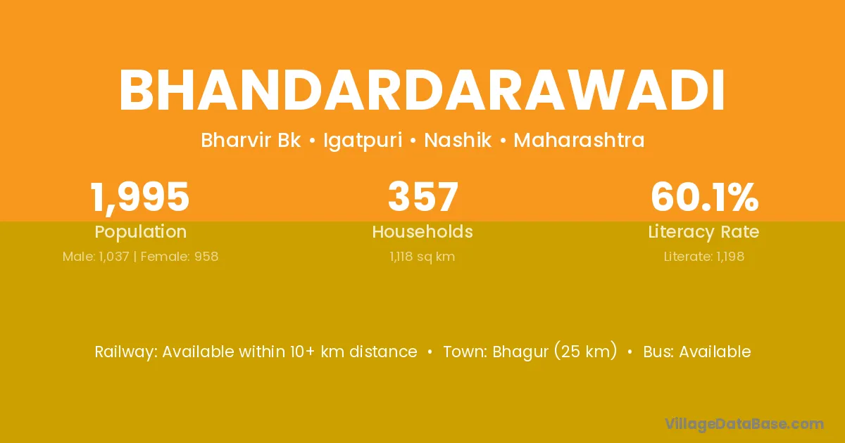 Bhagur (25 km) is the nearest town to Bhandardarawadi village for major economic activities and is located approximately 25 km away.