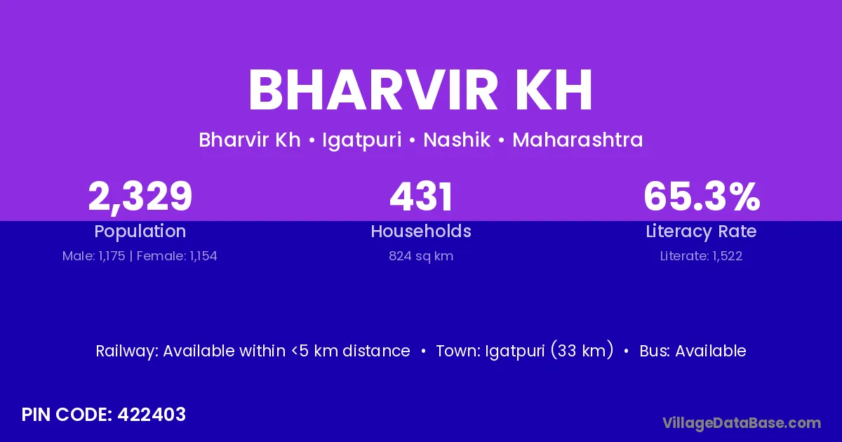 Igatpuri (33 km) is the nearest town to Bharvir Kh village for major economic activities and is located approximately 33 km away.