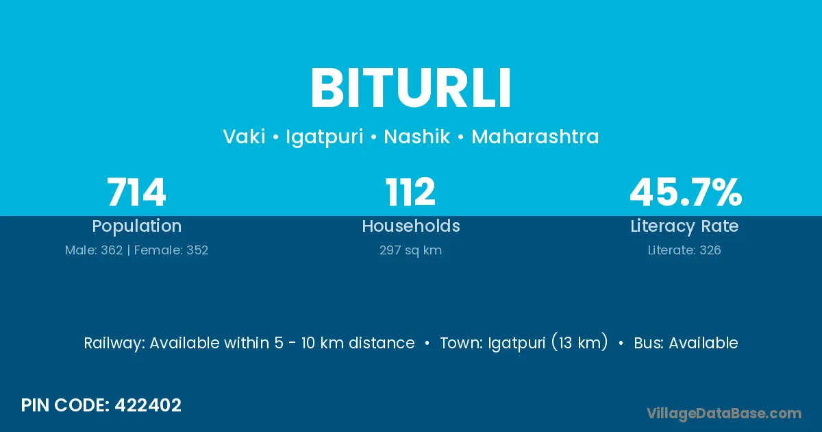 Igatpuri (13 km) is the nearest town to Biturli village for major economic activities and is located approximately 13 km away.