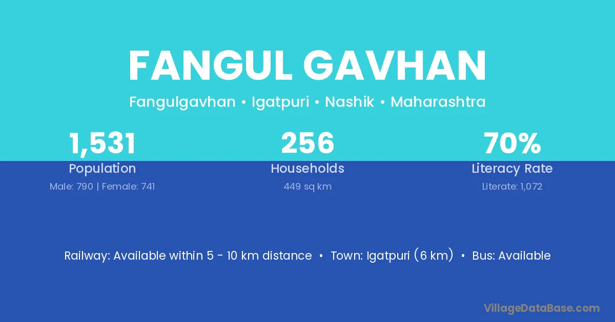 Igatpuri (6 km) is the nearest town to Fangul Gavhan village for major economic activities and is located approximately 6 km away.