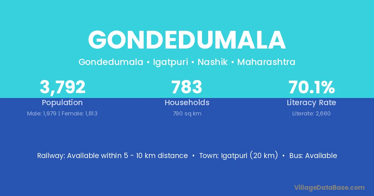 Igatpuri (20 km) is the nearest town to Gondedumala village for major economic activities and is located approximately 20 km away.
