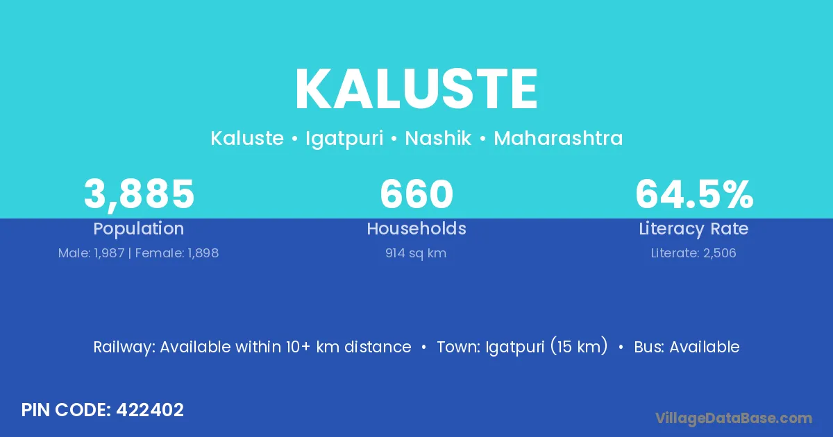 Igatpuri (15 km) is the nearest town to Kaluste village for major economic activities and is located approximately 15 km away.