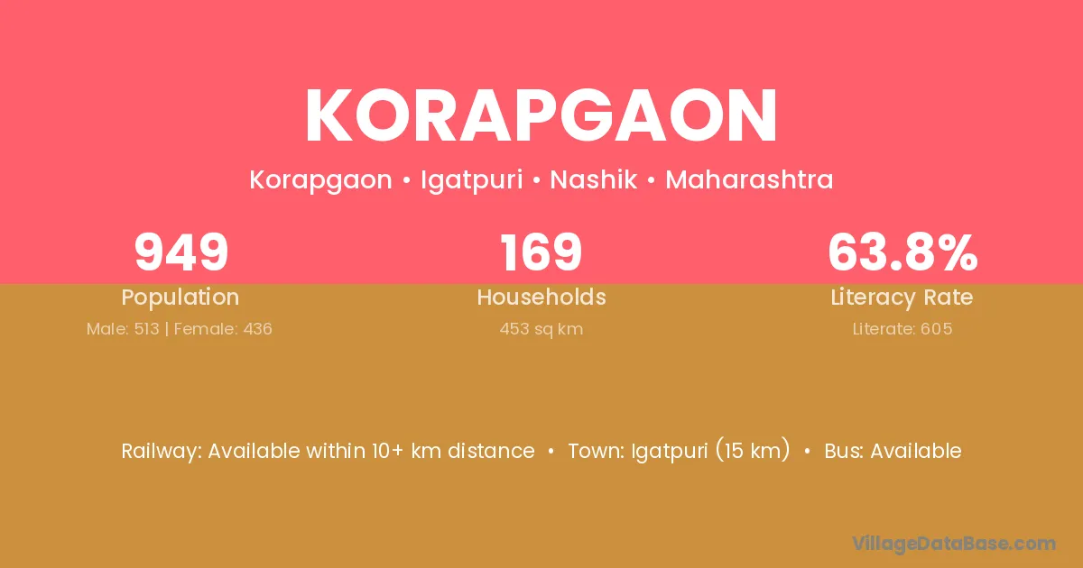 Igatpuri (15 km) is the nearest town to Korapgaon village for major economic activities and is located approximately 15 km away.