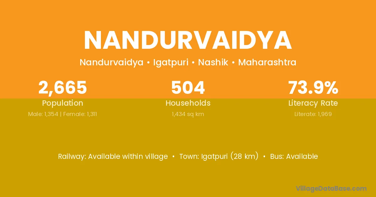 Igatpuri (28 km) is the nearest town to Nandurvaidya village for major economic activities and is located approximately 28 km away.