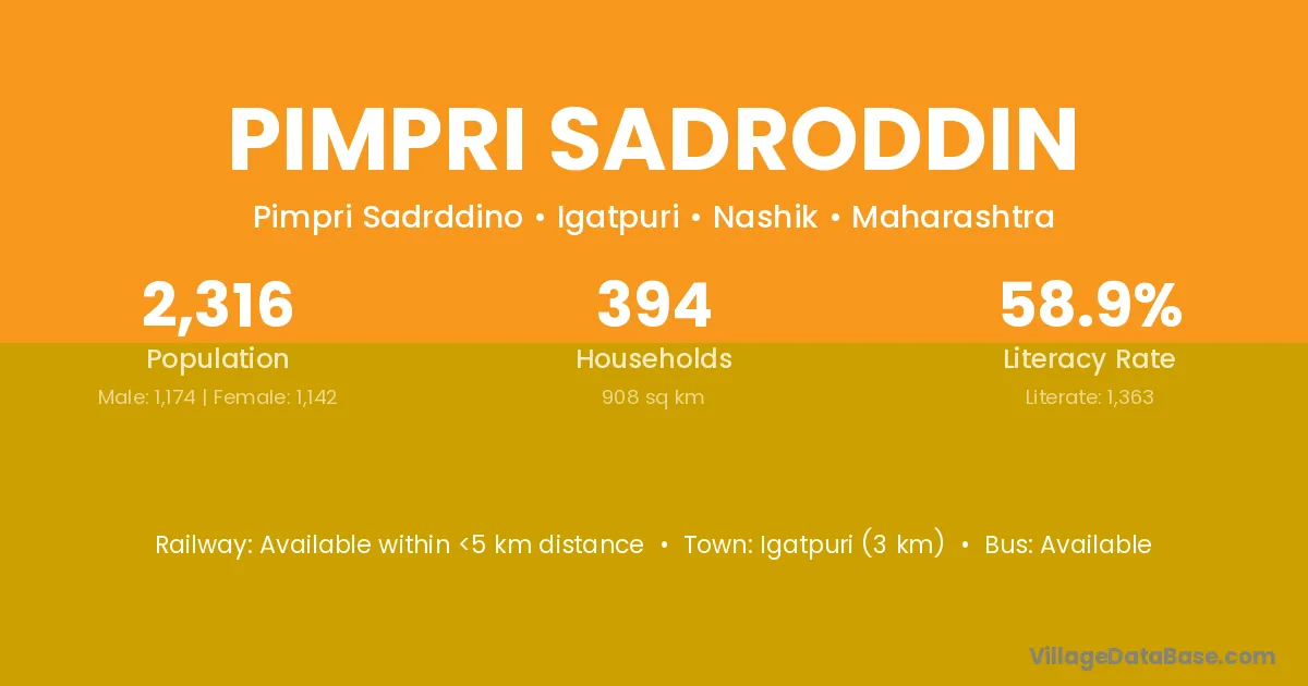 Igatpuri (3 km) is the nearest town to Pimpri Sadroddin village for major economic activities and is located approximately 3 km away.