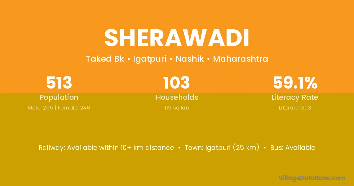 Igatpuri (25 km) is the nearest town to Sherawadi village for major economic activities and is located approximately 25 km away.