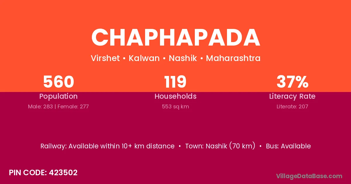 Nashik (70 km) is the nearest town to Chaphapada village for major economic activities and is located approximately 70 km away.