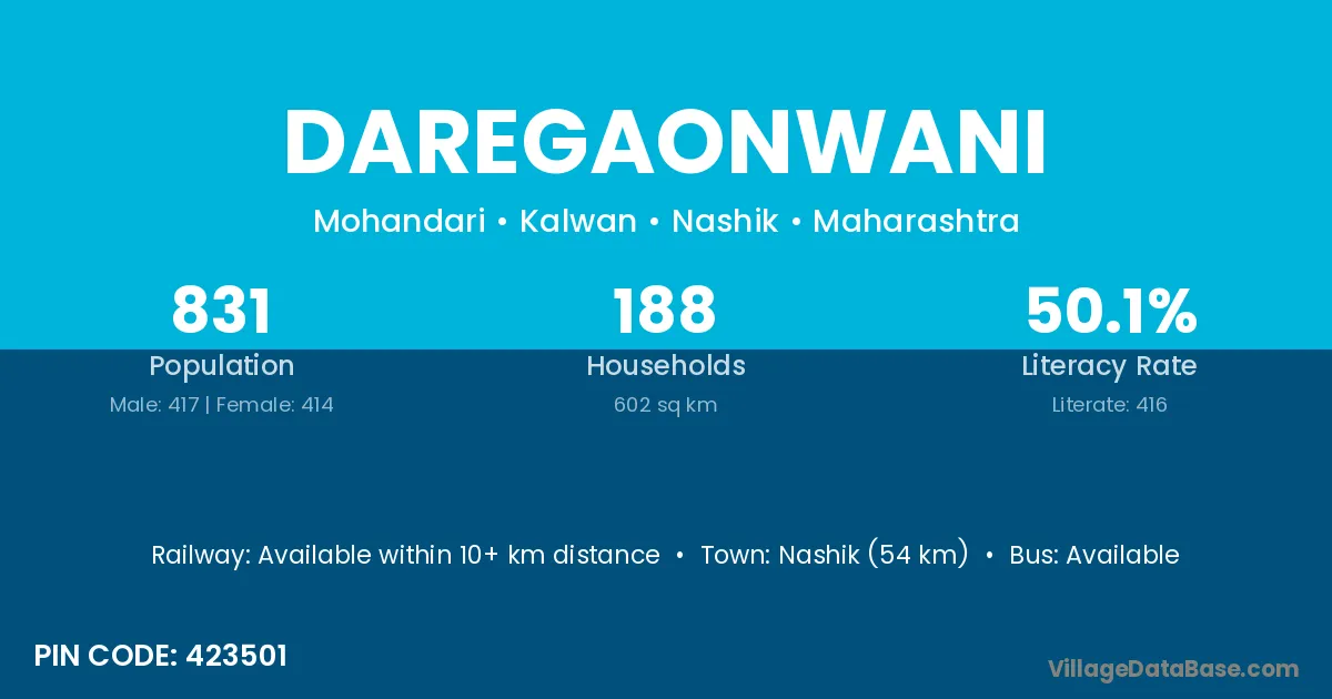 Daregaonwani village has a total population of 831 people, of which 417 are males and 414 are females.