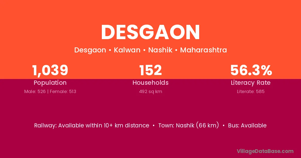 Nashik (66 km) is the nearest town to Desgaon village for major economic activities and is located approximately 66 km away.