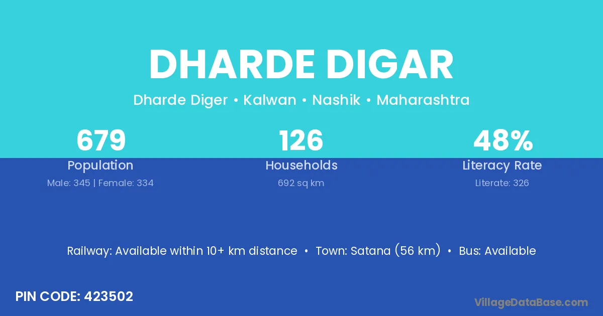 Satana (56 km) is the nearest town to Dharde Digar village for major economic activities and is located approximately 56 km away.