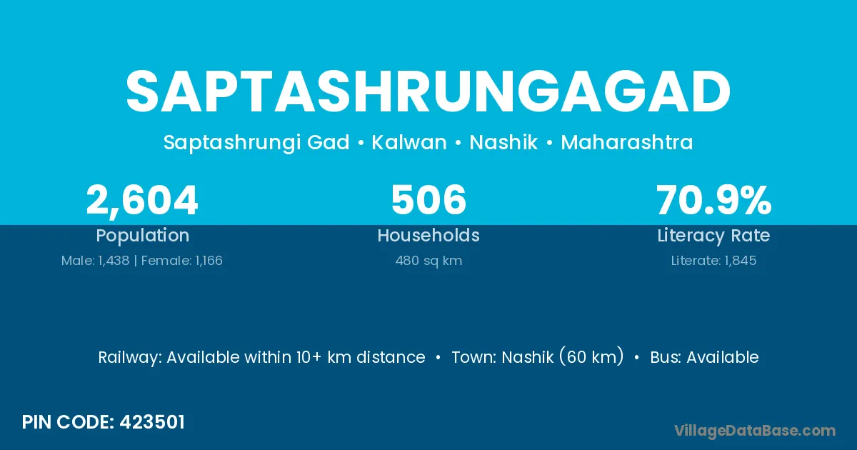 Nashik (60 km) is the nearest town to Saptashrungagad village for major economic activities and is located approximately 60 km away.