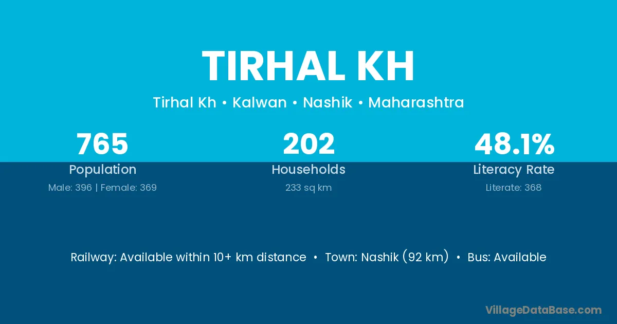Nashik (92 km) is the nearest town to Tirhal Kh village for major economic activities and is located approximately 92 km away.