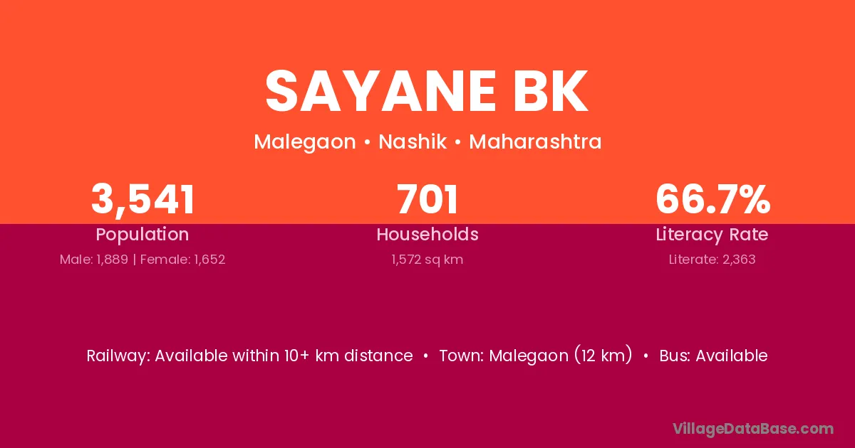Malegaon (12 km) is the nearest town to Sayane Bk village for major economic activities and is located approximately 12 km away.