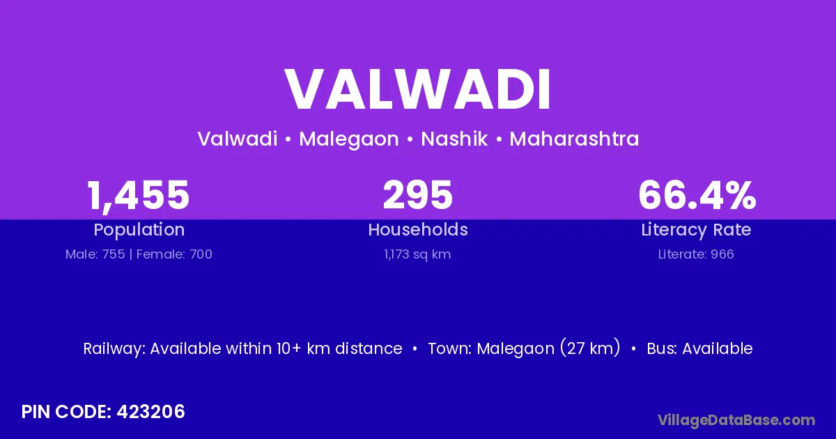 Malegaon (27 km) is the nearest town to Valwadi village for major economic activities and is located approximately 27 km away.