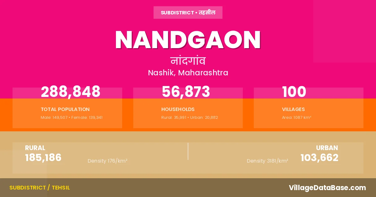 According to the 2011 census The total area of Nandgaon Tehsil is 1087 km², with a population of 288848 people. The population density is 266 inhabitants per square kilometre, and there are approximately 56873 houses in the sub district.