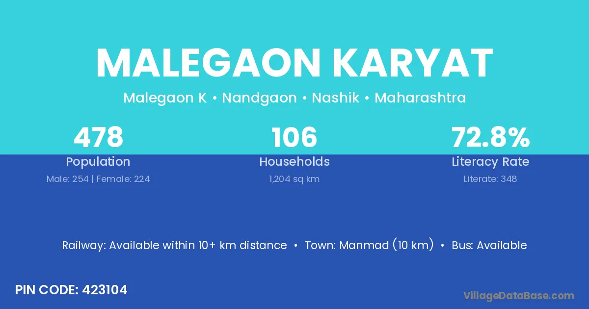 Malegaon Karyat village has a total population of 478 people, of which 254 are males and 224 are females.