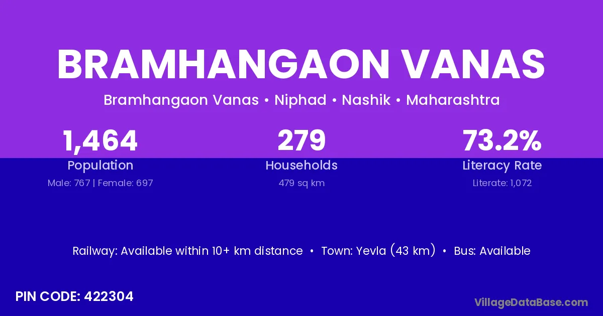 Yevla (43 km) is the nearest town to Bramhangaon Vanas village for major economic activities and is located approximately 43 km away.