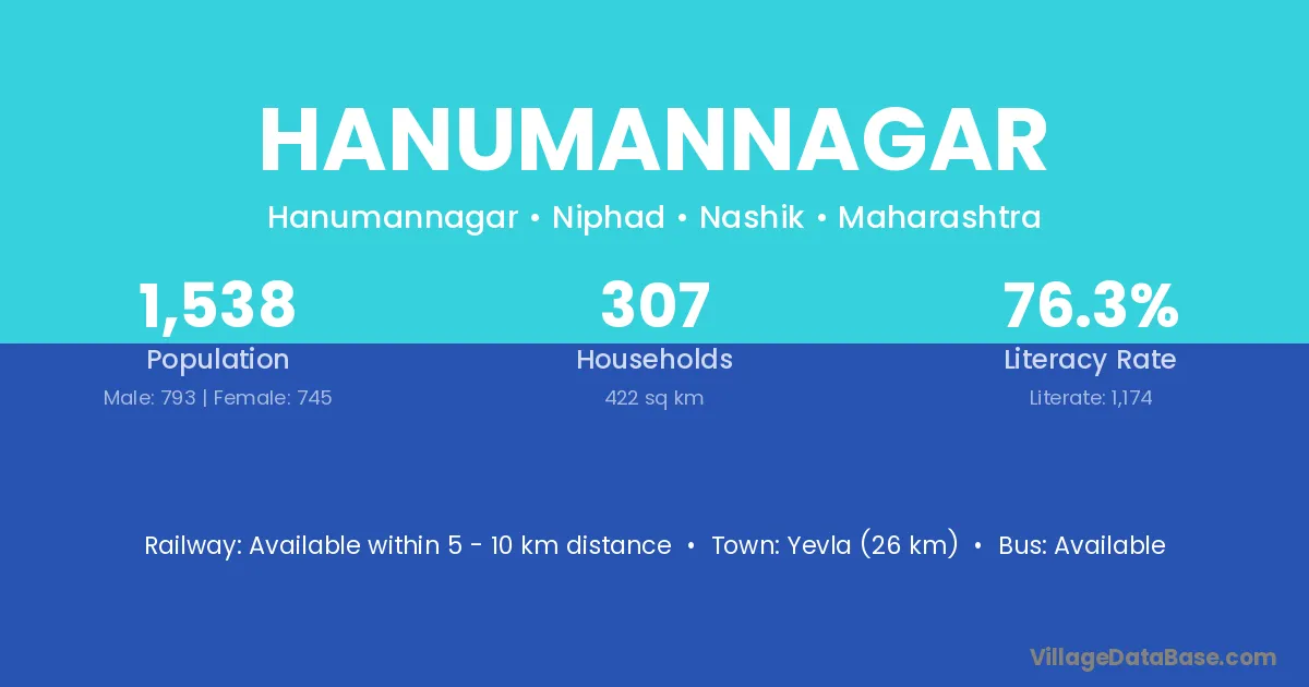Yevla (26 km) is the nearest town to Hanumannagar village for major economic activities and is located approximately 26 km away.