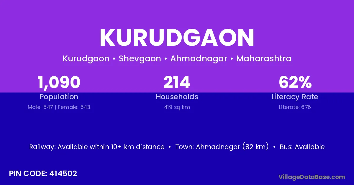 Kurudgaon village has a total population of 1,102 people, of which 565 are males and 537 are females.