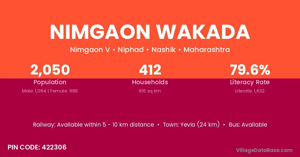 Yevla (24 km) is the nearest town to Nimgaon Wakada village for major economic activities and is located approximately 24 km away.