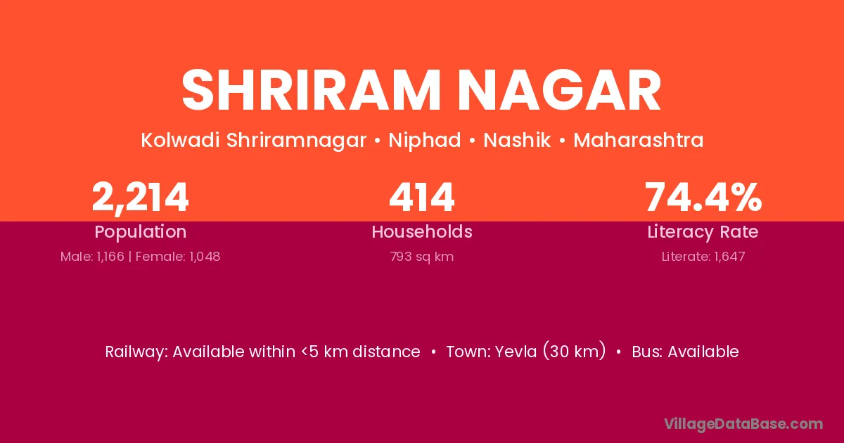 Shriram Nagar village has a total population of 2,214 people, of which 1,166 are males and 1,048 are females.
