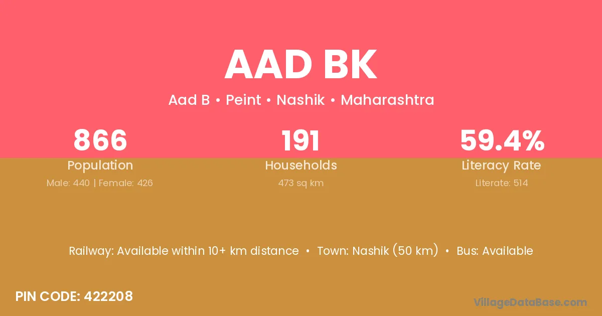 Nashik (50 km) is the nearest town to Aad Bk village for major economic activities and is located approximately 50 km away.