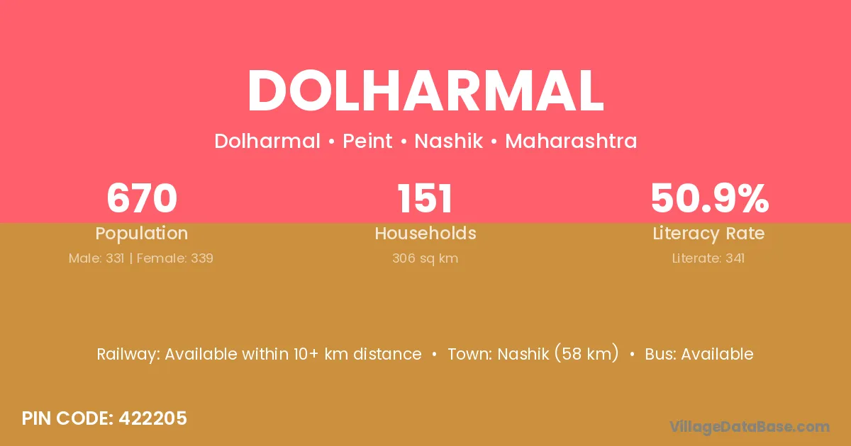 Nashik (58 km) is the nearest town to Dolharmal village for major economic activities and is located approximately 58 km away.