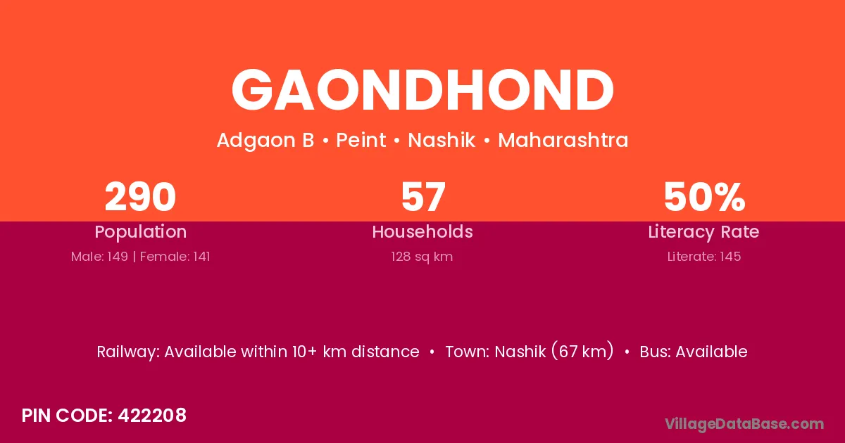 Nashik (67 km) is the nearest town to Gaondhond village for major economic activities and is located approximately 67 km away.