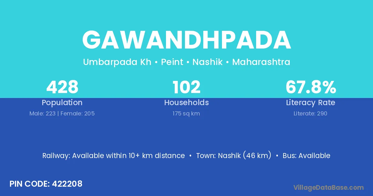 Gawandhpada village has a total population of 428 people, of which 223 are males and 205 are females.