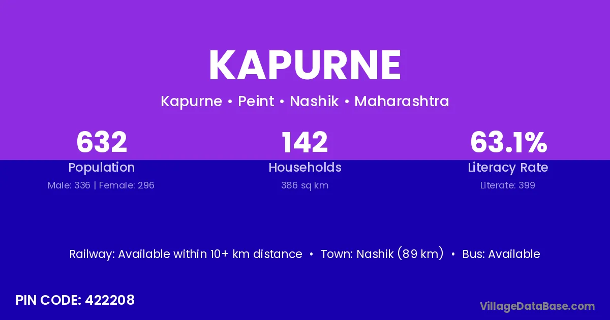 Nashik (89 km) is the nearest town to Kapurne village for major economic activities and is located approximately 89 km away.