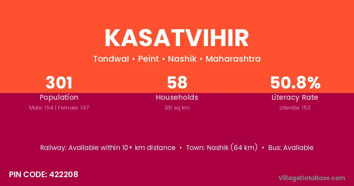 Nashik (64 km) is the nearest town to Kasatvihir village for major economic activities and is located approximately 64 km away.