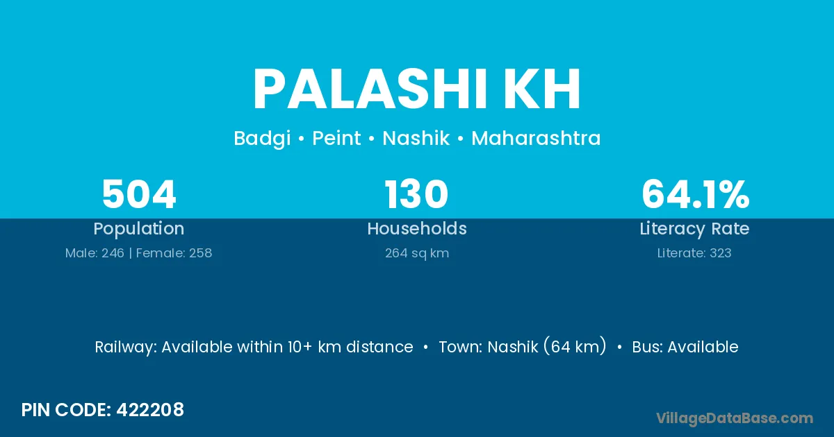 Nashik (64 km) is the nearest town to Palashi Kh village for major economic activities and is located approximately 64 km away.