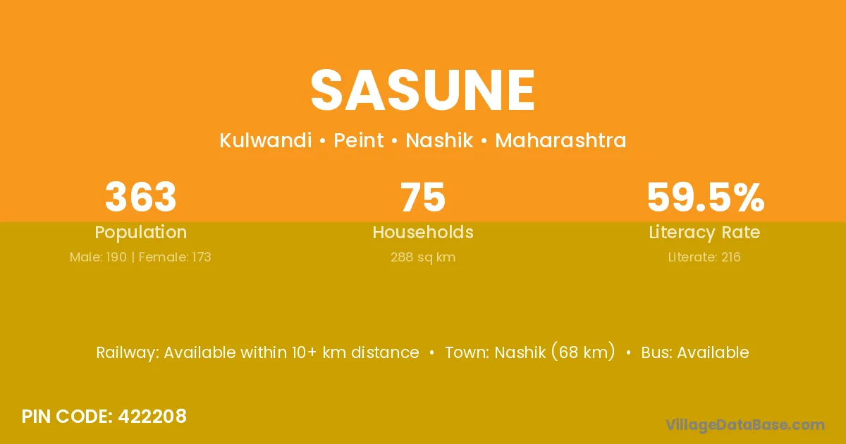 Nashik (68 km) is the nearest town to Sasune village for major economic activities and is located approximately 68 km away.