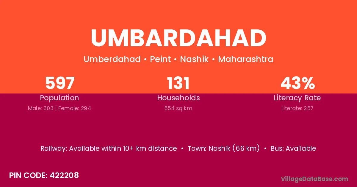 Nashik (66 km) is the nearest town to Umbardahad village for major economic activities and is located approximately 66 km away.
