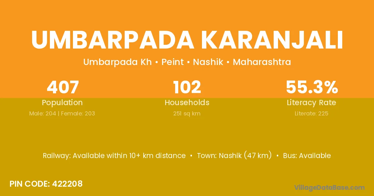 Nashik (47 km) is the nearest town to Umbarpada Karanjali village for major economic activities and is located approximately 47 km away.