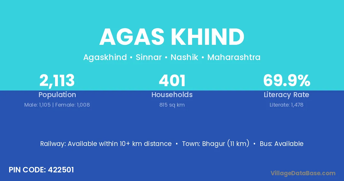 Bhagur (11 km) is the nearest town to Agas Khind village for major economic activities and is located approximately 11 km away.