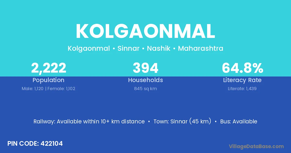 Sinnar (45 km) is the nearest town to Kolgaonmal village for major economic activities and is located approximately 45 km away.